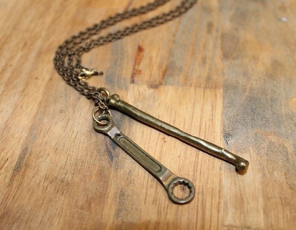 Necklace, double charm, femur bone & wrench, long link chain, brass