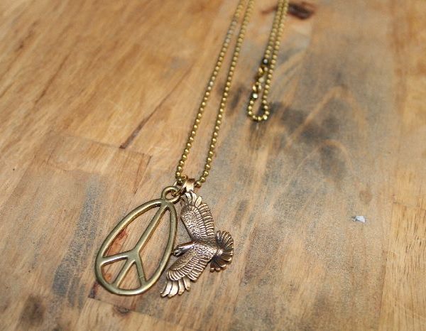 NECKLACE – DOUBLE CHARM – PEACE SIGN & CHISELED SOARING EAGLE – BALL CHAIN