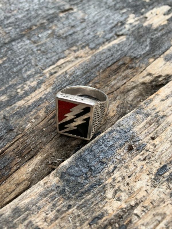 G&S RING, MOTORCYCLE BIKER STYLE, DOUBLE LIGHTNING BOLT, INLAID WITH CRUSHED CORAL & ONYX, SILVER MOUNTING, SILVER/BLACK/RED/SILVER, SIZE 9