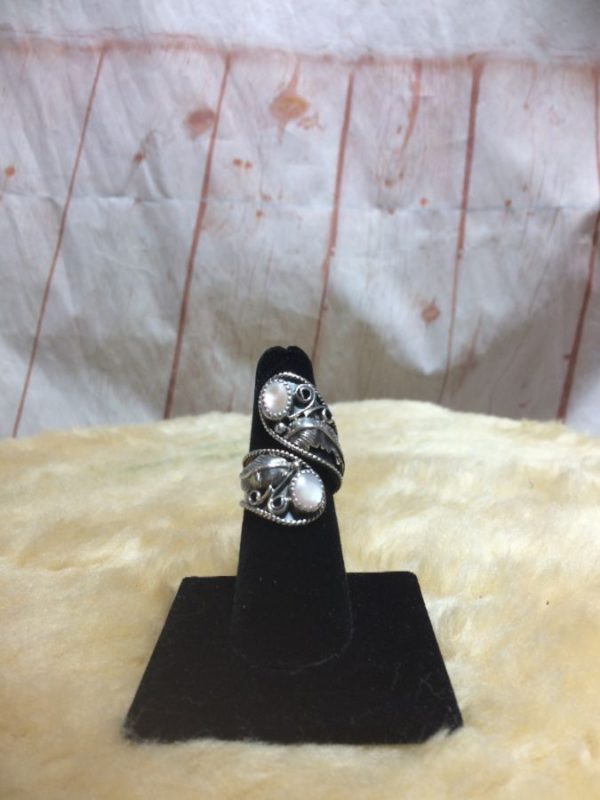 DOUBLE MOTHER OF PEARL STONES IN FEATHER DESIGN ORNATE WRAPPED STYLE RING