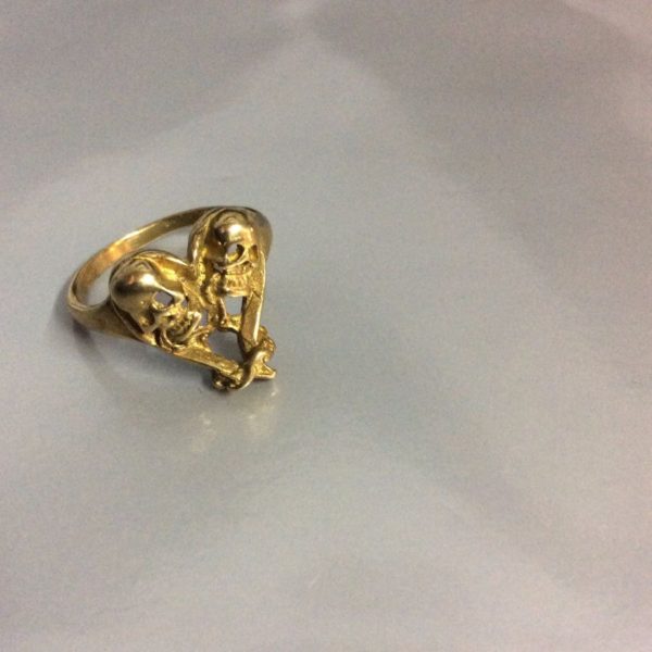 Ring, heart design with 2 skulls, brass metal, gold, size 7.5