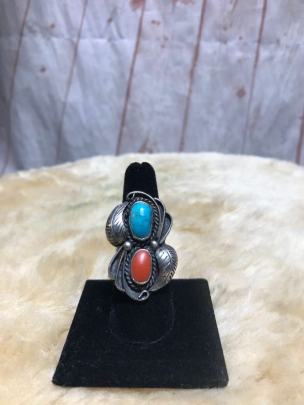 DOUBLE TIER TURQUOISE AND CORAL RING DOUBLE LEAF DESIGN STERLING SILVER 925