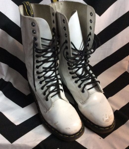 Dr. Martens boots, patent leather, tall, 14 eyelet holes, white/black laces, size 10 as is