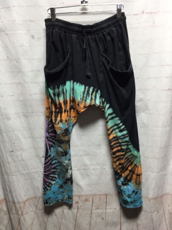 Harem pants, cotton, tie-dyed, elastic waist with drawstring, large front pockets, back pockets, black/blue/orange/purple, size S