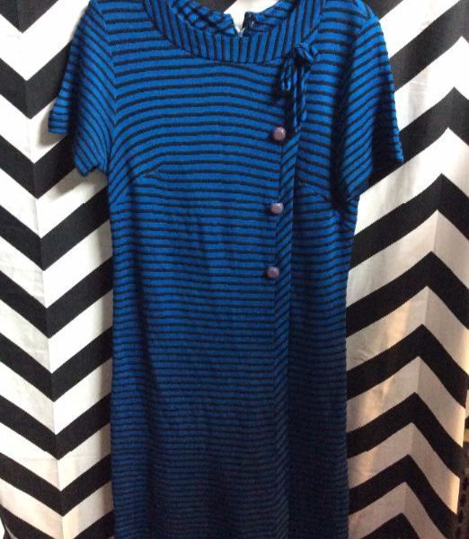 DRESS, ZIPPER IN BACK, BUTTONS & BOW TRIM, HORIZONTAL STRIPE PATTERN, BLACK/BLUE