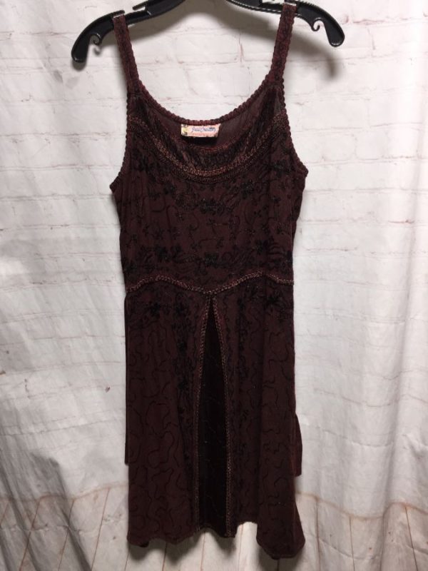JUST CRUISING DRESS, PULLOVER, TANK STYLE TOP, SPAGHETTI STRAPS, GODET IN FRONT AT CENTER WAIST, EMBROIDERED COLOR ON COLOR FLORAL PATTERN ON FRONT OF DRESS, BACK TIE AT WAIST, MAROON
