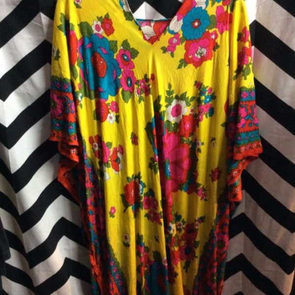 Kaftan/dress, polyester, bold floral print, yellow/pink/blue