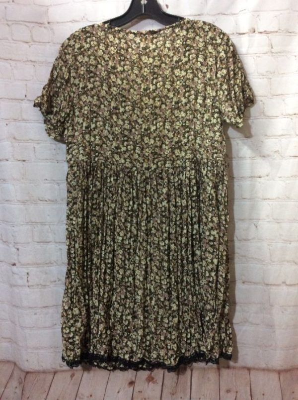 Luxury Jones dress, short sleeves, short sleeves, fitted top & gathered lower half, small flower print, lace around hem, black/mauve/brown/green