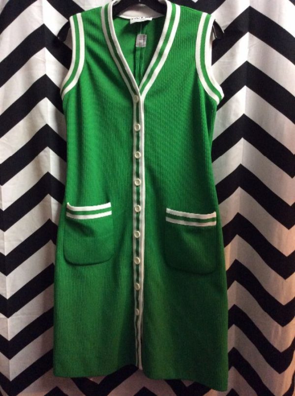 Act III v-neck dress, sleeveless button-up with two front pockets, green/white
