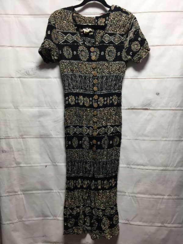 Nina Piccalino dress, rayon, wrinkle style fabric, button-up with wood buttons, ethnic patterned horizontal stripe design, black/tan/white