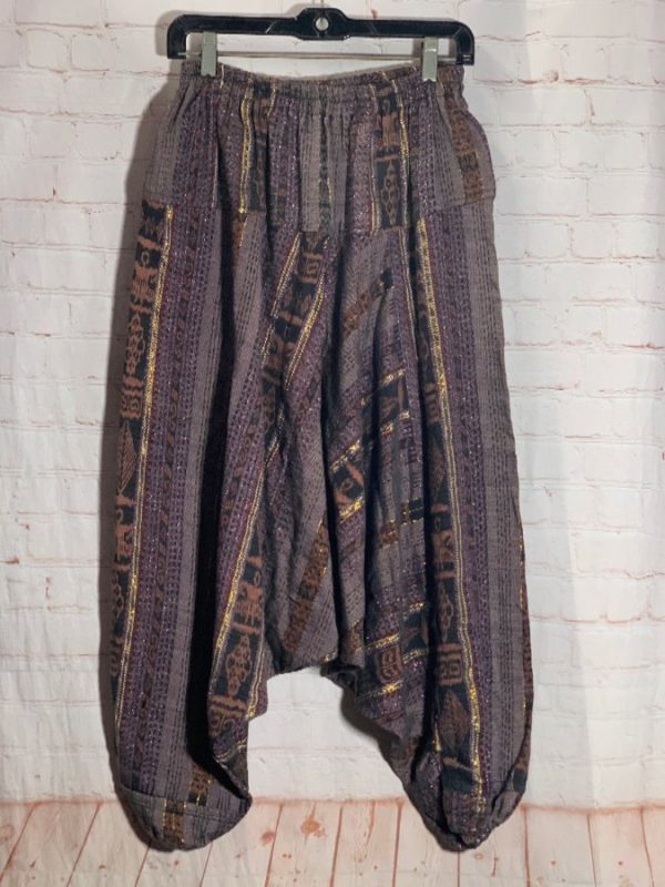 Harem pants, linen, drop crotch, elastic waist, fitted upper panel, Ikat textile with glitter, angled striped pattern, brown/purple/gold, size 36″W
