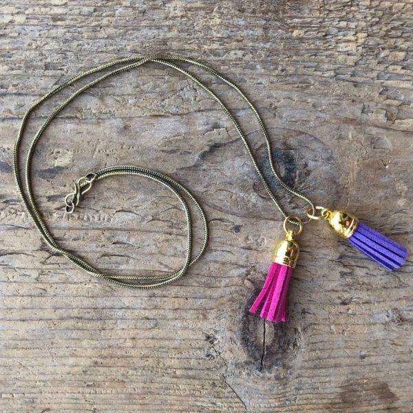 Necklace, dual mini leather tassel charms with gold colored metal caps, long brass snake chain, gold/pink/purple, one size