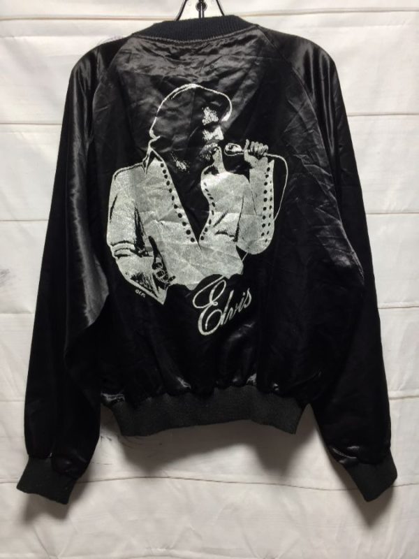 DIAMOND DUST BOMBER JACKET, ACETATE, BUTTON-UP WITH SNAPS, ELVIS, SCREEN PRINTED GRAPHIC IN GLITTER INK, BLACK/SILVER WHITE, SIZE XL