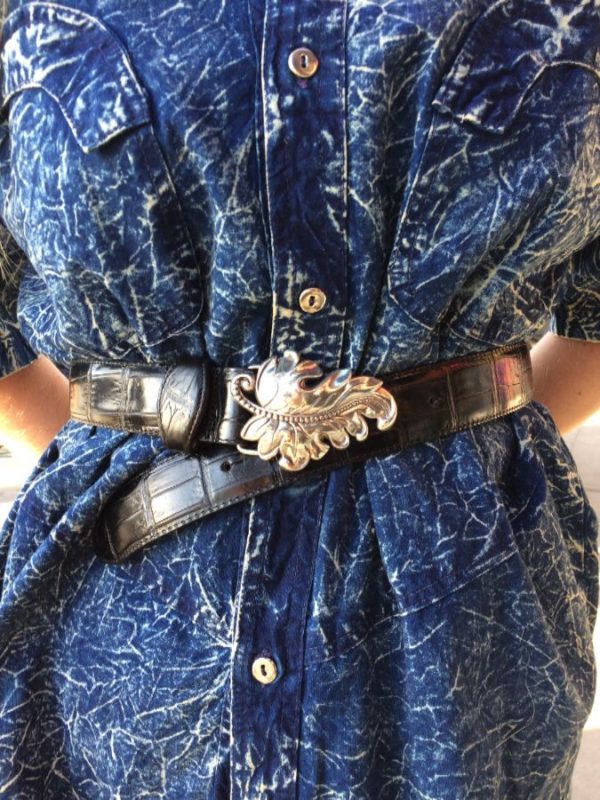 EMBOSSED CROCODILE LEATHER BELT WITH ORNATE SILVER LEAF BUCKLE