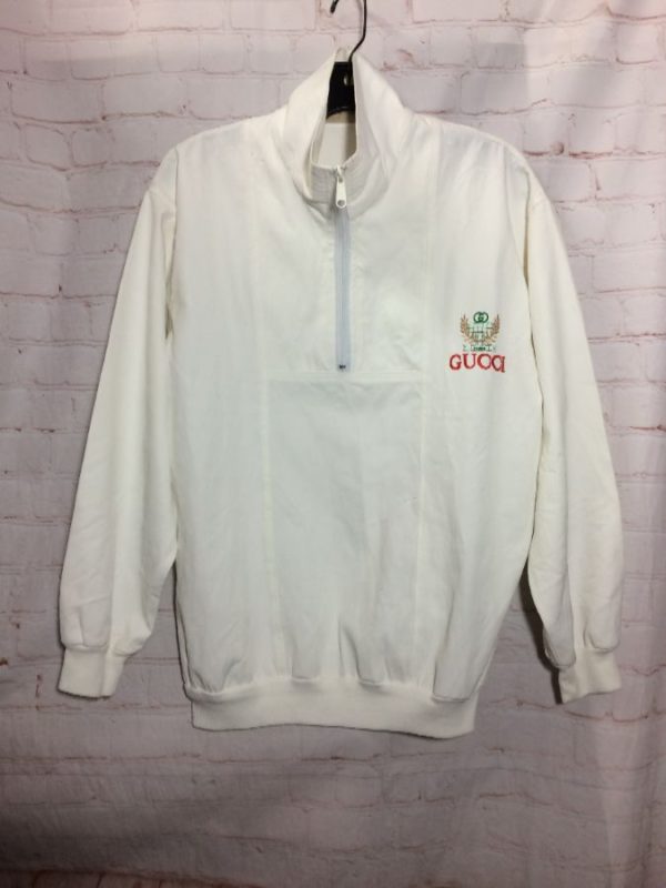 Gucci tennis windbreaker jacket, pullover, cotton, 1/4 zip-up, embroidered Gucci Paris left chest logo, off white/red/green/tan, size L As is