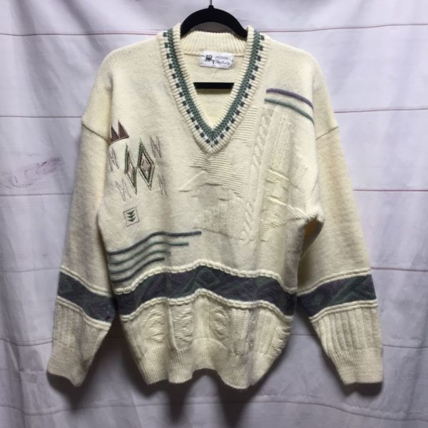 PROSECRET SWEATER, KNIT, PULLOVER, V-NECK WITH CONTRASTING TRIM, HORIZONTAL STRIPES DESIGN ON BODY & SLEEVES, EMBROIDERED AZTEC DESIGN ON RIGHT CHEST AREA, CREME/GRAY/BROWN, SIZE L AS IS