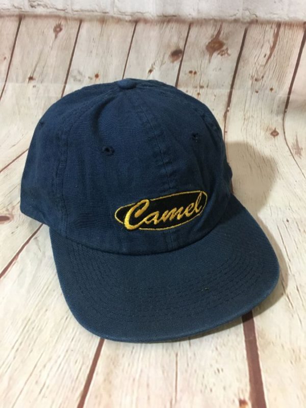 CLASSIC HAT, BASEBALL STYLE, CAMEL CIGARETTES, EMBROIDERED FRONT LETTERING & TINY CAMEL LEFT SIDE, SNAP-BACK, NAVY/YELLOW, SIZE ADJUSTABLE