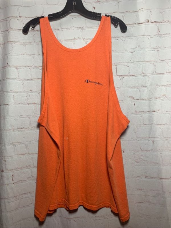Champion tank top, embroidered logo on left front chest, orange/black, size XXL As is