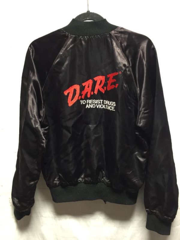 EMBROIDERED DARE ACETATE BOMBER JACKET RED INTERIOR LINING – AS IS D.A.R.E.