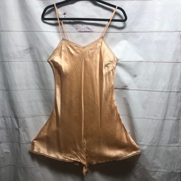 Trillium romper/slip, silk, lingerie, spaghetti straps, lace trim, embroidered flowers, snap/button-up crotch closure, peach, size 36 As is