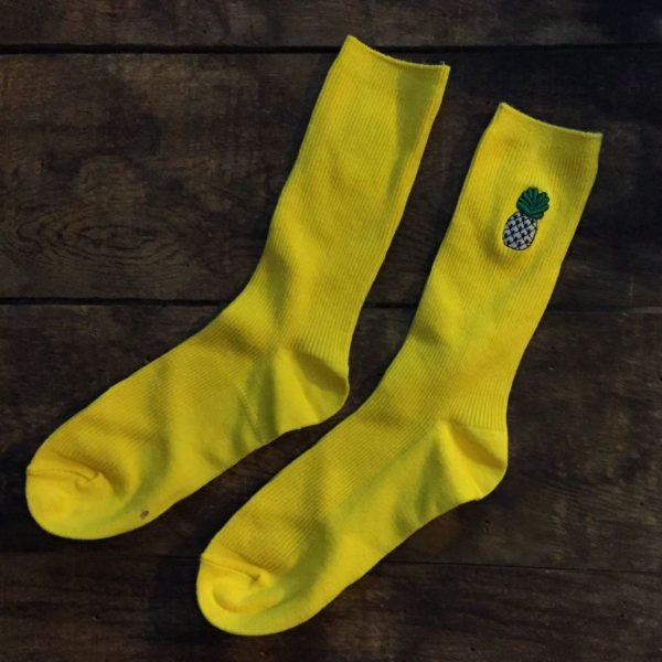 SOCKS, RIBBED SOCKS, MID CALF, EMBROIDERED PINEAPPLE PICTORIAL, YELLOW