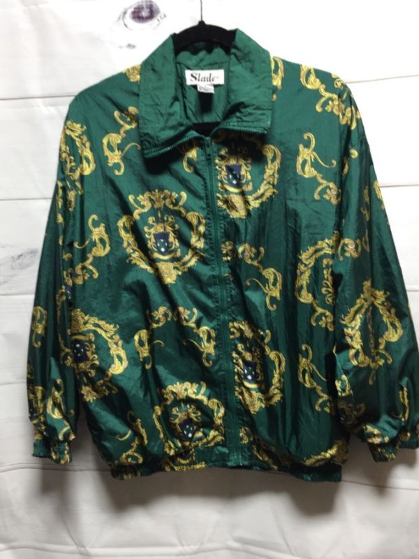 Slade windbreaker jacket, zip-up, lined, ornate Baroque design print, emerald green/gold/blue, size S