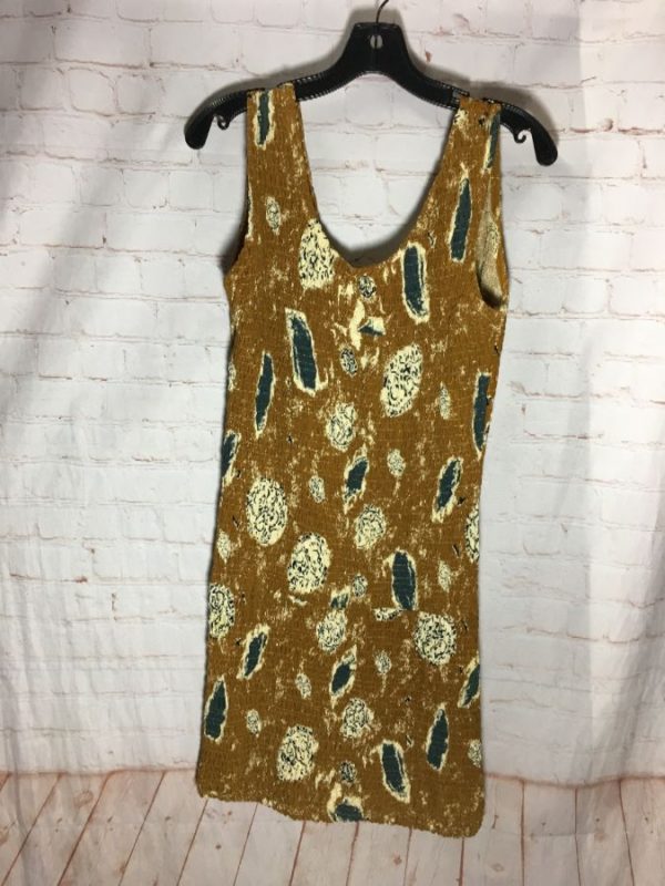 Dress, pullover, body con style, sleeveless, low cut back, elastic gathered crinkled fabric, ethnic print design, mustard yellow/off white/dark blue, size M
