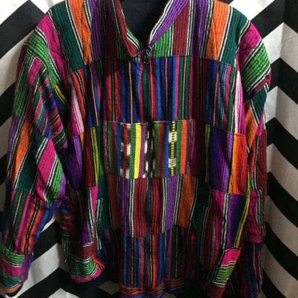 Bomber jacket, zip-up, patchwork design, ethnic pattern, multi, size L