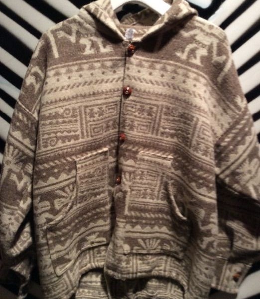 Wool jacket with hood, button up, beige/brown ethnic pattern, size M