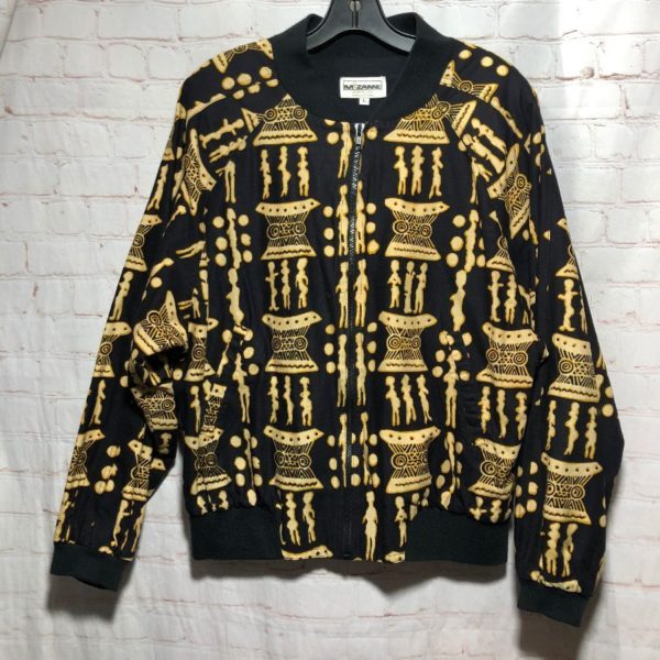 Mizanne bomber Jacket, cotton, zip-up, Ethnic all over print with little figures and African drums, contrasting trim on collar/cuffs/hem, black/yellow/beige, size L