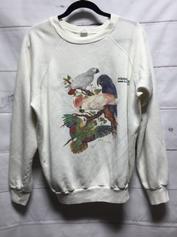 Pyramid Birds Inc. sweatshirt, pullover, crew-neck, exotic birds/parrots/cockatoo, screen printed front design, white/gray/purple/red/green/brown/pink, size M As is