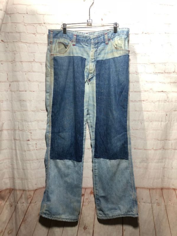 RETRO 1970S PATCHWORK DENIM JEANS FADED DARK DENIM PATCHES W/ PLAID INSIDE LINING