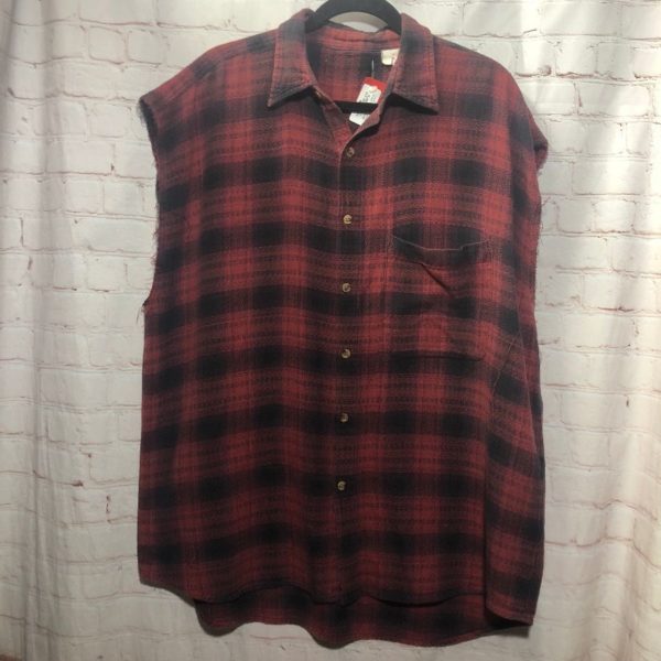 SHIRT, CUT-OUT SLEEVES, BUTTON-UP, PLAID DESIGN, FRONT POCKET, FADED, RED/BLACK, SIZE XL
