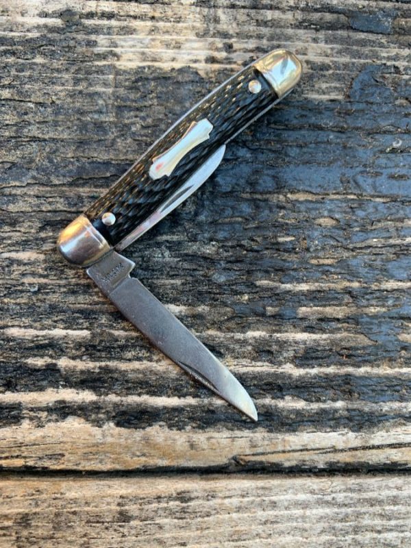 COLONIAL POCKET KNIFE, FAUX ANTLER GRAIN TEXTURE, 2 BLADES, GOLD METAL END PIECES, GOLD/BROWN/BLACK