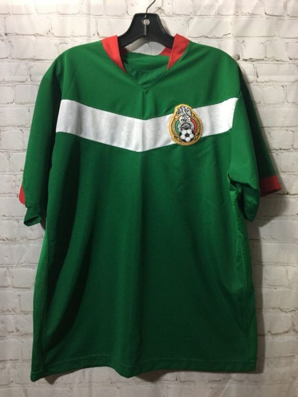 Fans Sports soccer jersey, Federacion Mexicana, embroidered patch on left front, contrasting trim on neck & sleeves, chevron stripe on chest, green/red/white, size M