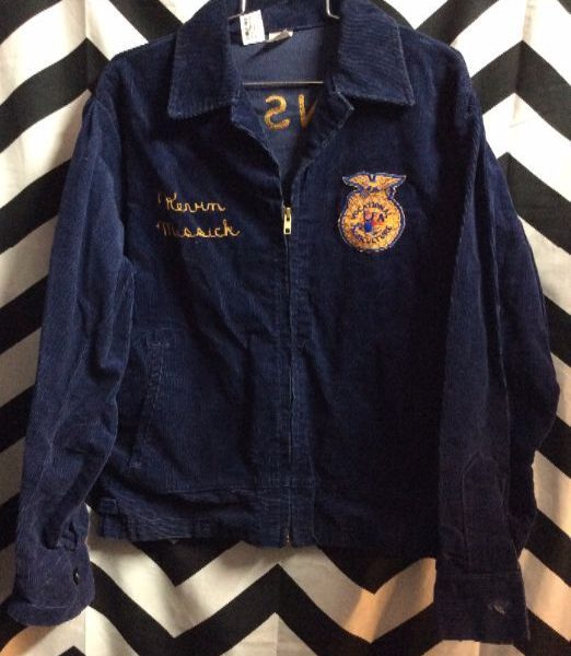 Williamsburg, Kansas FFA vocational jacket, zip-up, corduroy, embroidered emblem on back, blue, size M