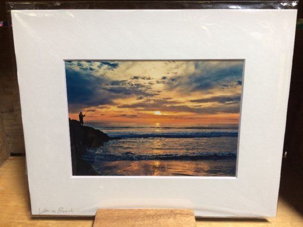 RAY RAE MOUNTED PHOTOGRAPH W/ FISHERMAN SURF FISHING AT SUNSET, LOCAL ARTIST, BLACK/OFF WHITE/NAVY BLUE/LIGHT BLUE/ORANGE/YELLOW , SIZE 5″ X 7″