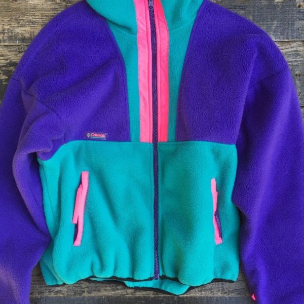 Columbia jacket, zip-up, fleece, color-block design, zippered front pockets, purple/teal/pink, size L