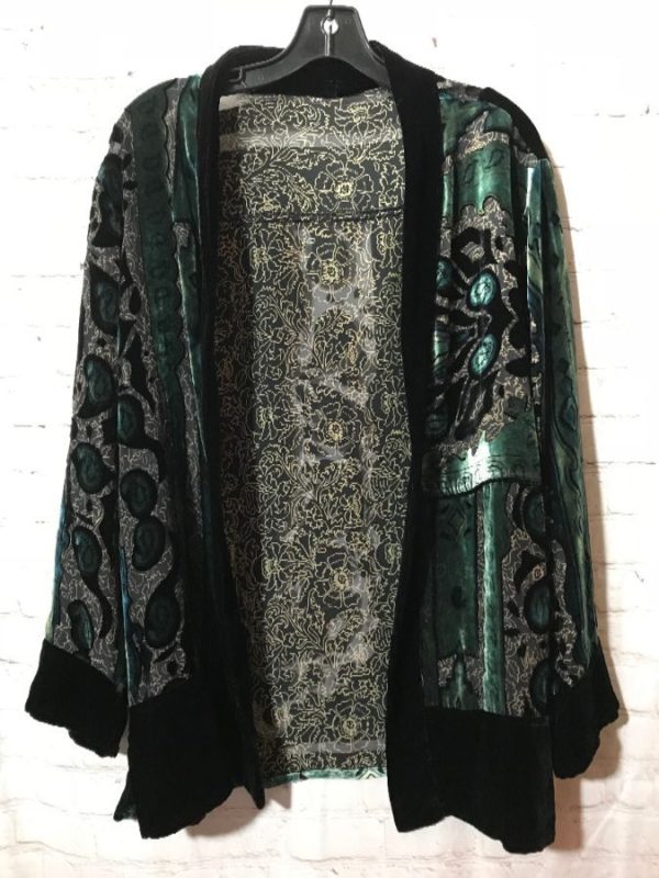 Hatti & Sons cardigan sweater, open front, Paisley & floral design flocked velvet on sheer panels, black/green, size L