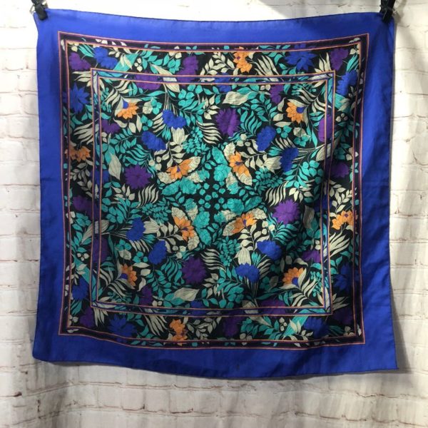 SCARF, SQUARE SHAPE, FLORAL & LEAF PRINT, ORANGE/PURPLE/OFF-WHITE/BLACK