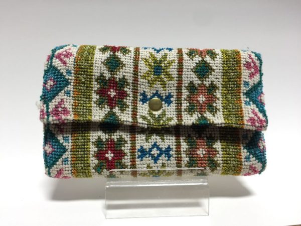 Wallet, clutch style, folds up & snap closure, woven fabric, floral & geometric shapes in striped design, separate compartments for change/bills/photo-credit cards, off white/pink/green /blue/red/teal