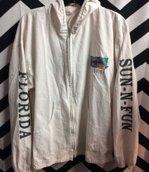 Windbreaker jacket, cotton, zip-up, hooded, Florida, Sun-N-Fun, white/multi, size M as is