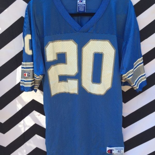 CHAMPION FOOTBALL JERSEY, DETROIT LIONS #20 BARRY SANDERS, STRIPE DESIGN ON SLEEVES
