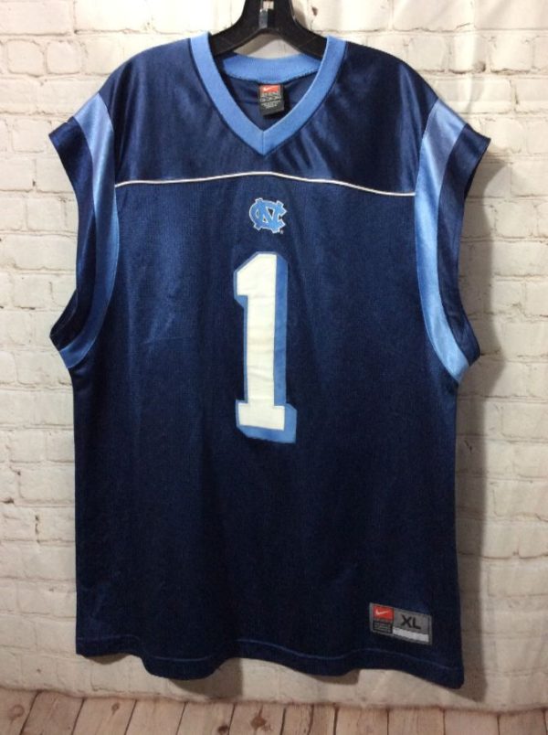 NIKE SPORTS JERSEY, PULLOVER, SLEEVELESS, CAROLINA TAR HEELS #1, NECK & SLEEVE TRIM, SCREEN PRINTED LETTERING & NUMBERS, BLUE/LIGHT-BLUE/WHITE, SIZE XL
