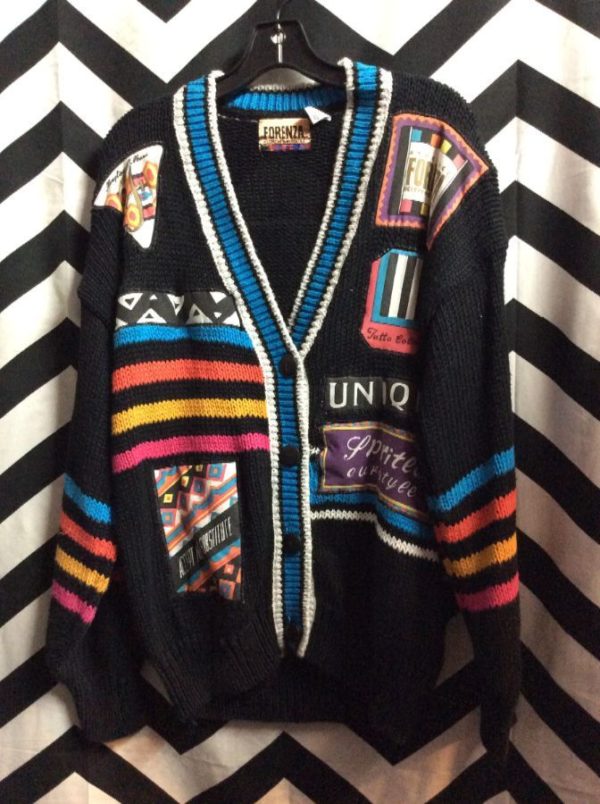 Forenza sweater/blazer, knitted, button-up, horizontal stripe design, patchwork applique designs, black/multi, size L