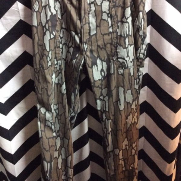 Pants, zip-up, camo design, forest pattern, made in USA, light gray/brown