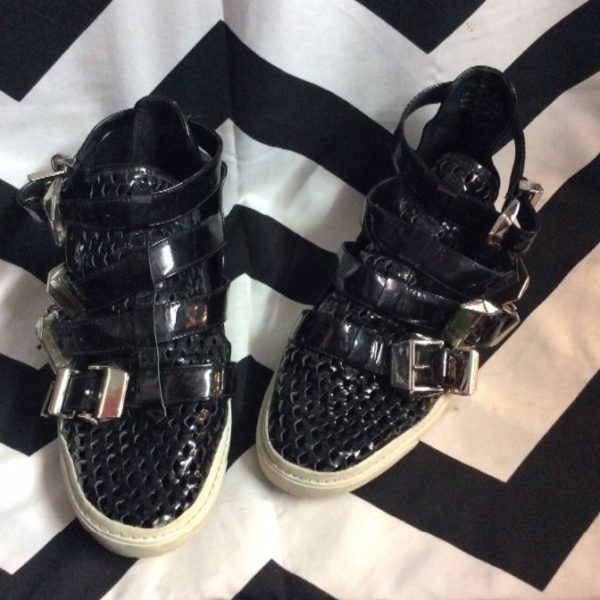 SHOES – PATENT LEATHER – FOUR BUCKLED STRAPS – HIGH TOP – MESH TOE