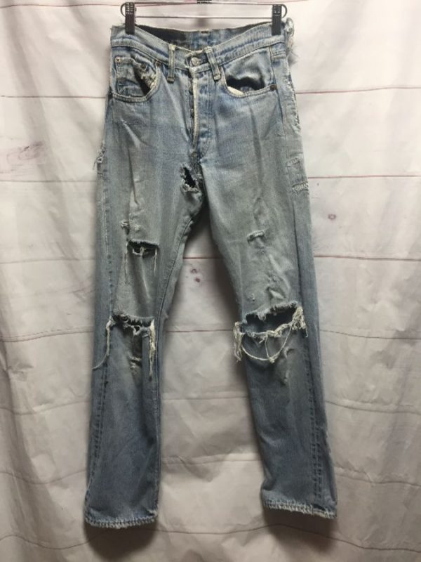 FULLY DISTRESSED & RIPPED LEVIS DENIM JEANS WITH BUTTON FLY & SELVEDGE HEM- AS IS