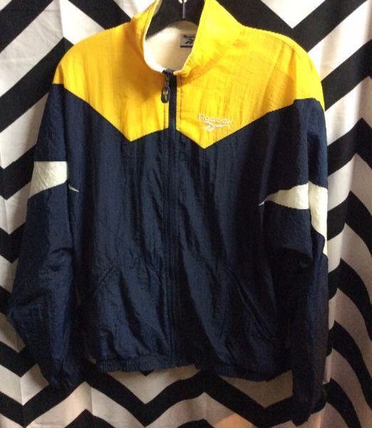 Reebok windbreaker, zip-up, fully lined, color block design, yellow/navy/white, size M