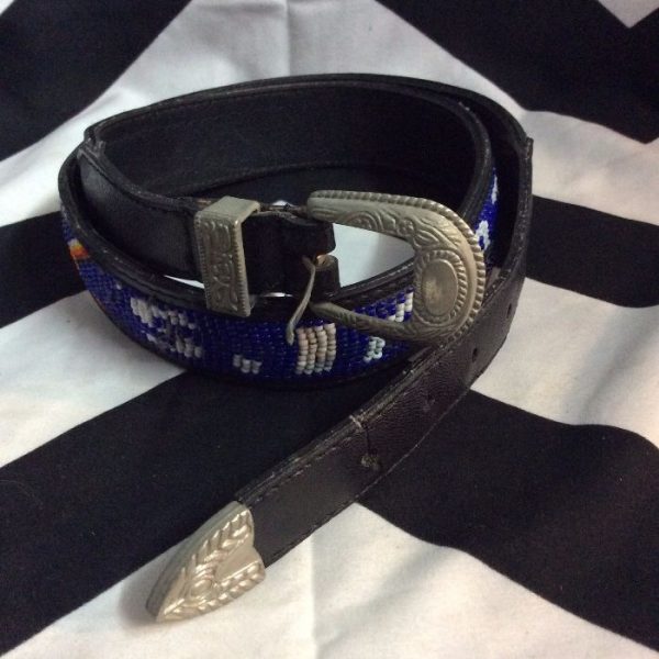 1980S NATIVE STYLE LEATHER BELT WITH BEADED NEVADA DESIGN AND EMBOSSED ZIG ZAG PATTERN